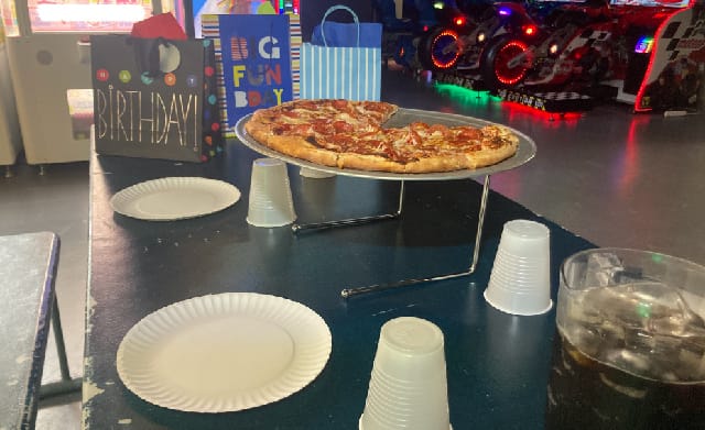 Our newest and smallest party package. Comes with one game of laser tag, one $5 arcade card per person and pizza to share. Grab a table in our open arcade area to celebrate. 5 players minimum, $15 per person