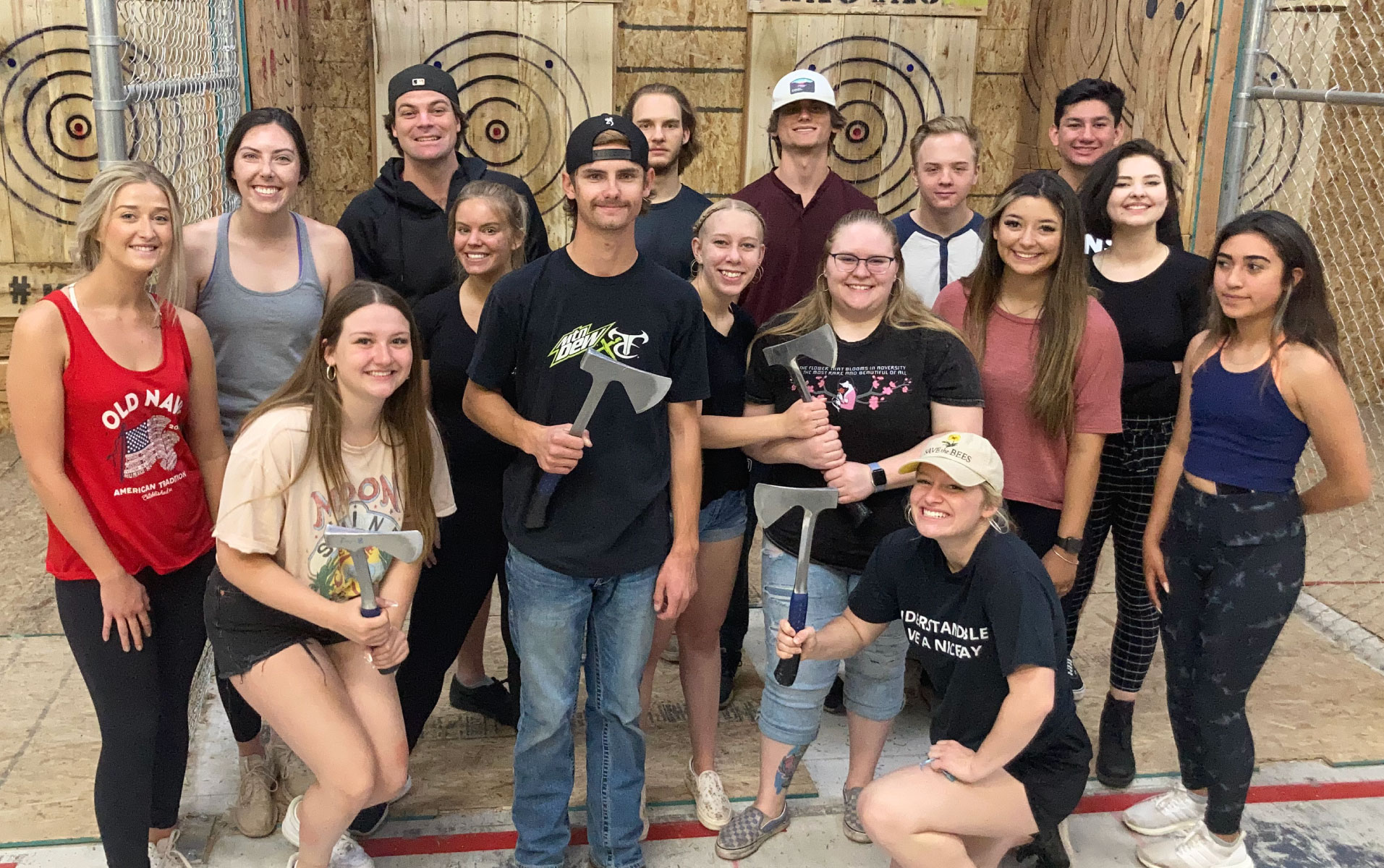 For groups of around 10 we have two pre-set party packages available: Axe Throwing Party or Deluxe Laser Tag Party. We can do multiple axe throwing parties for groups up to about 40 people.