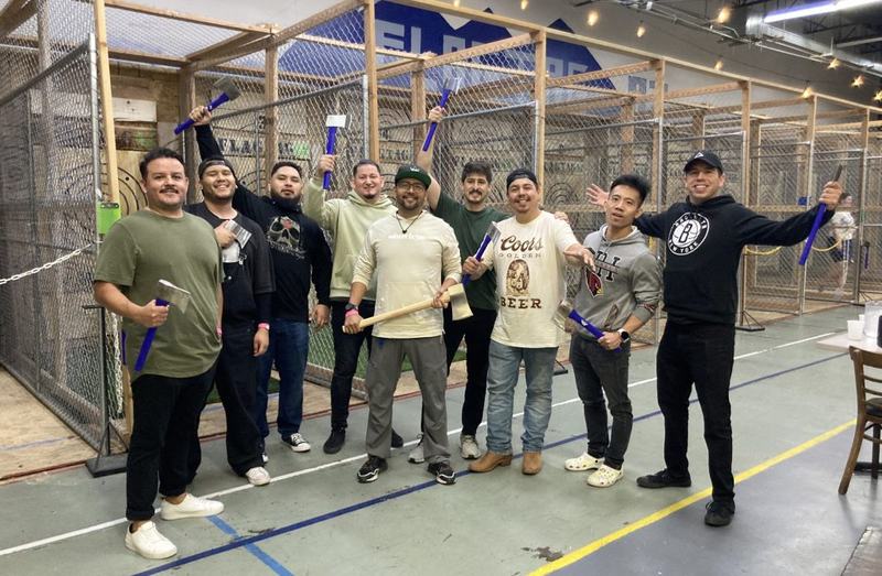 For groups of around 10 we have two pre-set party packages available: Axe Throwing Party or Deluxe Laser Tag Party. We can do multiple axe throwing parties for groups up to about 40 people.
